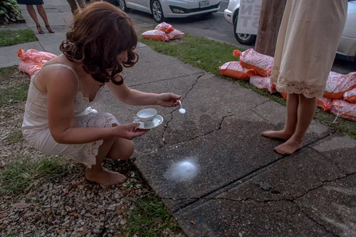 In part I of Warning Signs four women wearing matching black formal dresses engaged in mark making and mark erasing while watching the sky for signs of danger. A woman with white gloves fit with sandpaper tips flips through an atlas erasing places and routes traveled. A woman holding a lace antimacassar covered chalk reel creates the same lines on the concrete while another erases them with spoons of water from a teacup. A woman blows silent air through a megaphone. Another uses a telescope to broadcast images of a storm on the side of the trailer. While both the acts of making and erasing the marks is futile, the work also forecasts the dangers of forgetting what has already been charted.