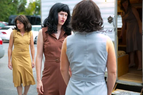 An anonymous collective persona inhabits each of The Bridge Club’s works, with each member artist donning wigs, shoes and a variety of carefully selected garments that relate directly to the site and concept of a specific work. The collective presence of the four costumed member artists lends an unsettling normative air to odd or uncomfortable situations, while costuming and object choices create a historical ambiguity of era that addresses change and continuity of gender and interpersonal histories, roles, expectations and behaviors.